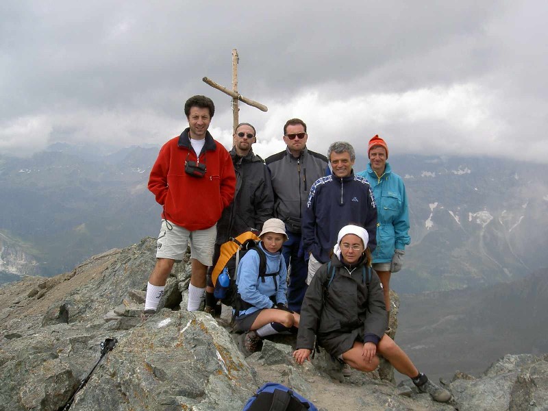 La classica foto con la croce di vetta: da sinistra Walterun, Andrea, Albertone, Franco e il mitico Silvio; accovacciate Antonella e Bruna. Manca Davide, autore della foto e immortalato nella foto precedente mentre si avventa su un pacchetto di biscotti |