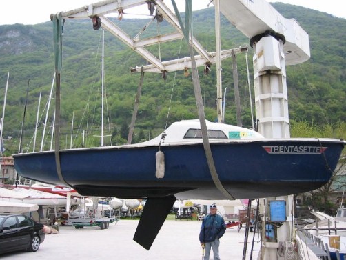Il restauro sostanziale dell' ammiraglia del circolo nautico si rende necessario dopo una ricognizione subacquea dello scafo: la vegetazione ormai ha nascosto le appendici della barca. L' armo è del 1972 e probabilmente non ha mai subito revisioni accurate; oltre all' opera viva (si fa per dire), anche quella morta ha bisogno di cure, il bottazzo è fatiscente e una vistosa ammaccatura sul giardinetto è stata riparata con del nastro adesivo; la galloccia di prua e le due a poppa sono rotte. L' albero è privo di crocette, o meglio quelle originali si sono rotte, e al loro posto campeggiano due boccioli di acciaio inox, che forse avrebbero dovuto essere collegate in qualche modo alle sartie. |