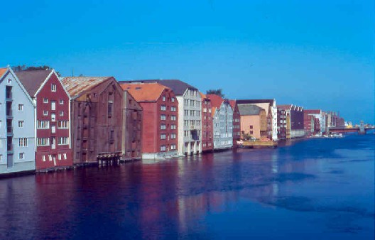 questo e' il banco di prova delle nuove generazioni di climber norvegesi, e da queste parti c' e' anche qualche pazzo scatenato che pratica un' attivita' chiamata "sky-diving", che consiste nel gettarsi nel vuoto dalla sommita' degli strapiombi, muniti di paracadute. Ogni tanto pero' il paracadute non si apre, e qualcuno si schianta; e' per questo che lo "sky-diving" e' stato vietato, ma va detto che i "divers" non tengono in gran considerazione i divieti. Trondheim: Nella tappa successiva raggiungiamo Trondheim, che fu antica capitale norvegese ed e' tuttora una delle citta' principali del paese. E' il punto piu' a nord del nostro viaggio, e anche se ormai siamo in agosto inoltrato le notti sono ancora incredibilmente brevi e chiare, alla sera c' e' una luce diffusa fino a dopo le 11. |