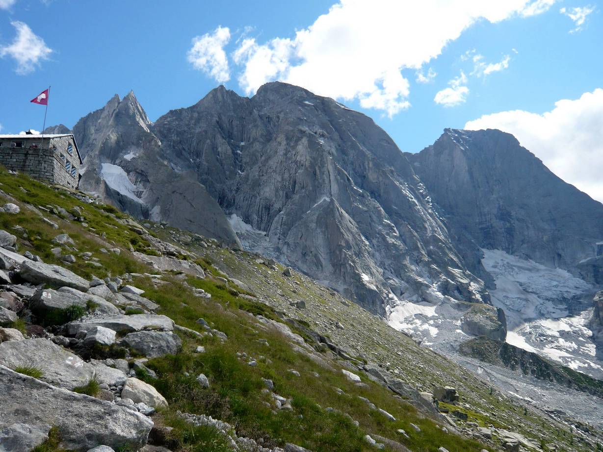 Il rif. Sasc Foura' con sullo sfondo la bastionata che separa la Svizzera dall' Italia |