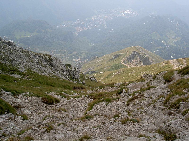In discesa lungo il sentiero "Cermenati", diretto a rapido ma piuttosto noioso; sullo sfondo si intravede Ballabio. |