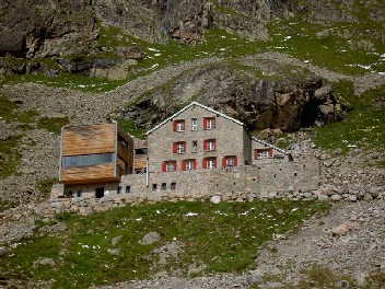 ![]() La capanna Tschierva, con a lato il cubo di legno che ne costituisce il recente ampliamento |